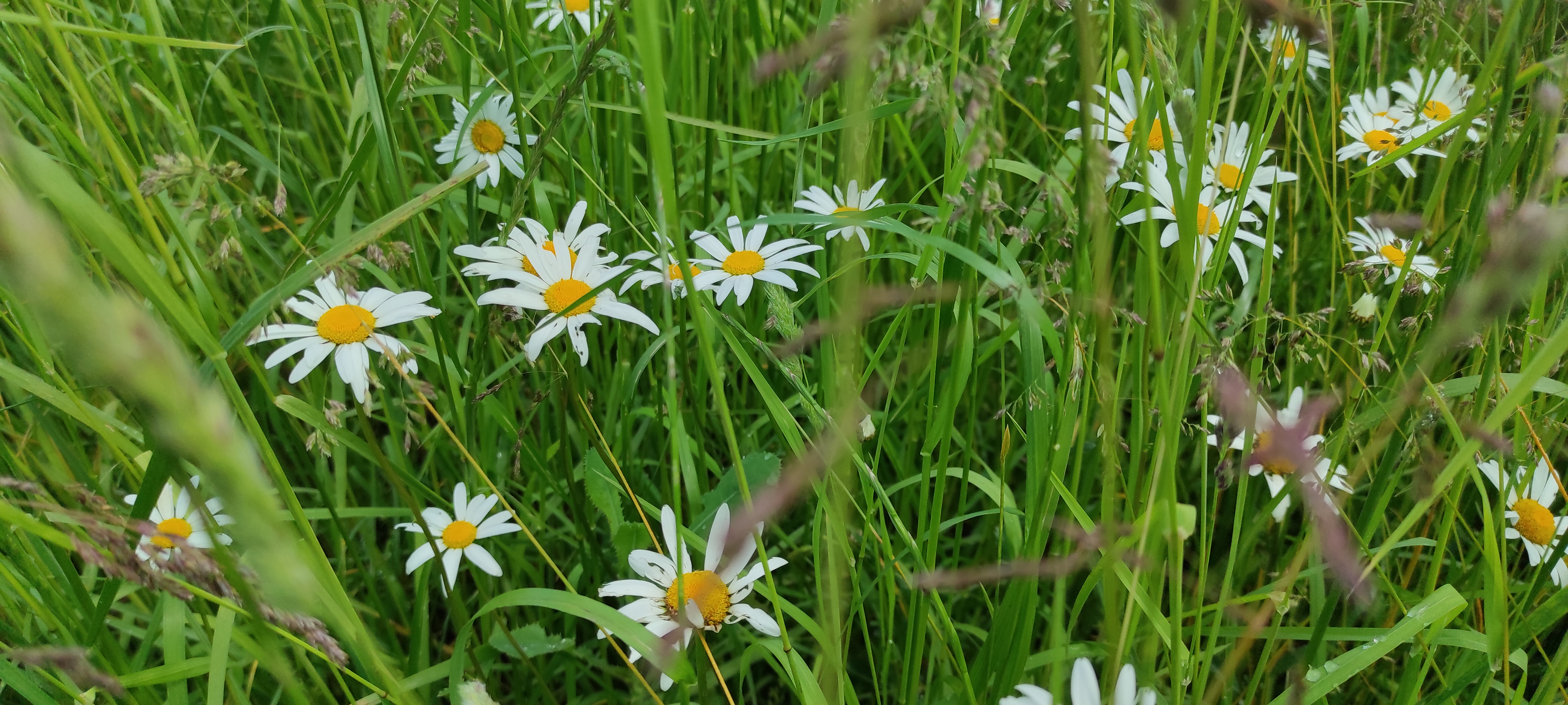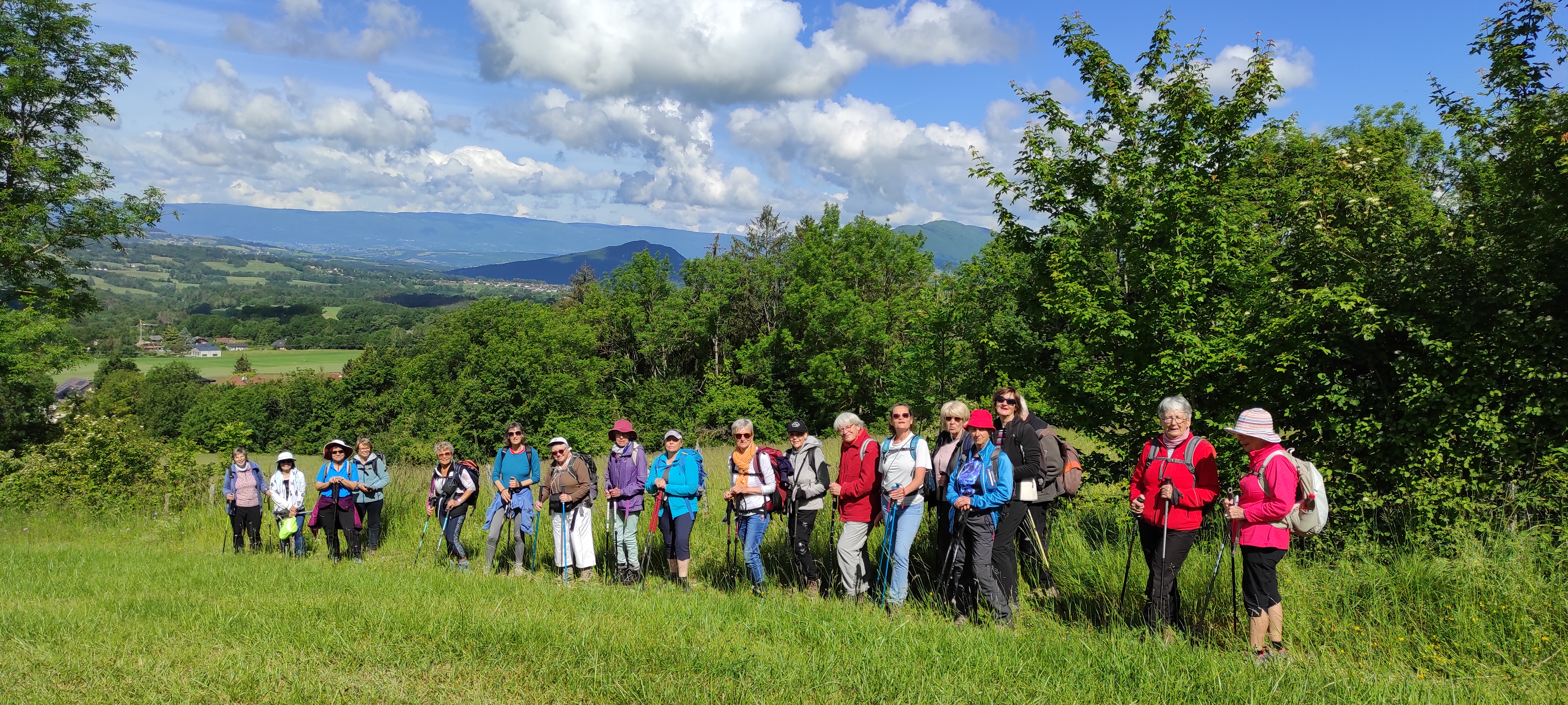 Nous empruntons le chemin du creux de l’Eglise et nous rejoignons la route de Perroud puis le chemin des Meuneries. Nous longeons des champs parsemés de coquelicots et de marguerites. La vue est magnifique sur Mésigny, la montagne de Musièges, le Vuache et plus loin le Colombier.
